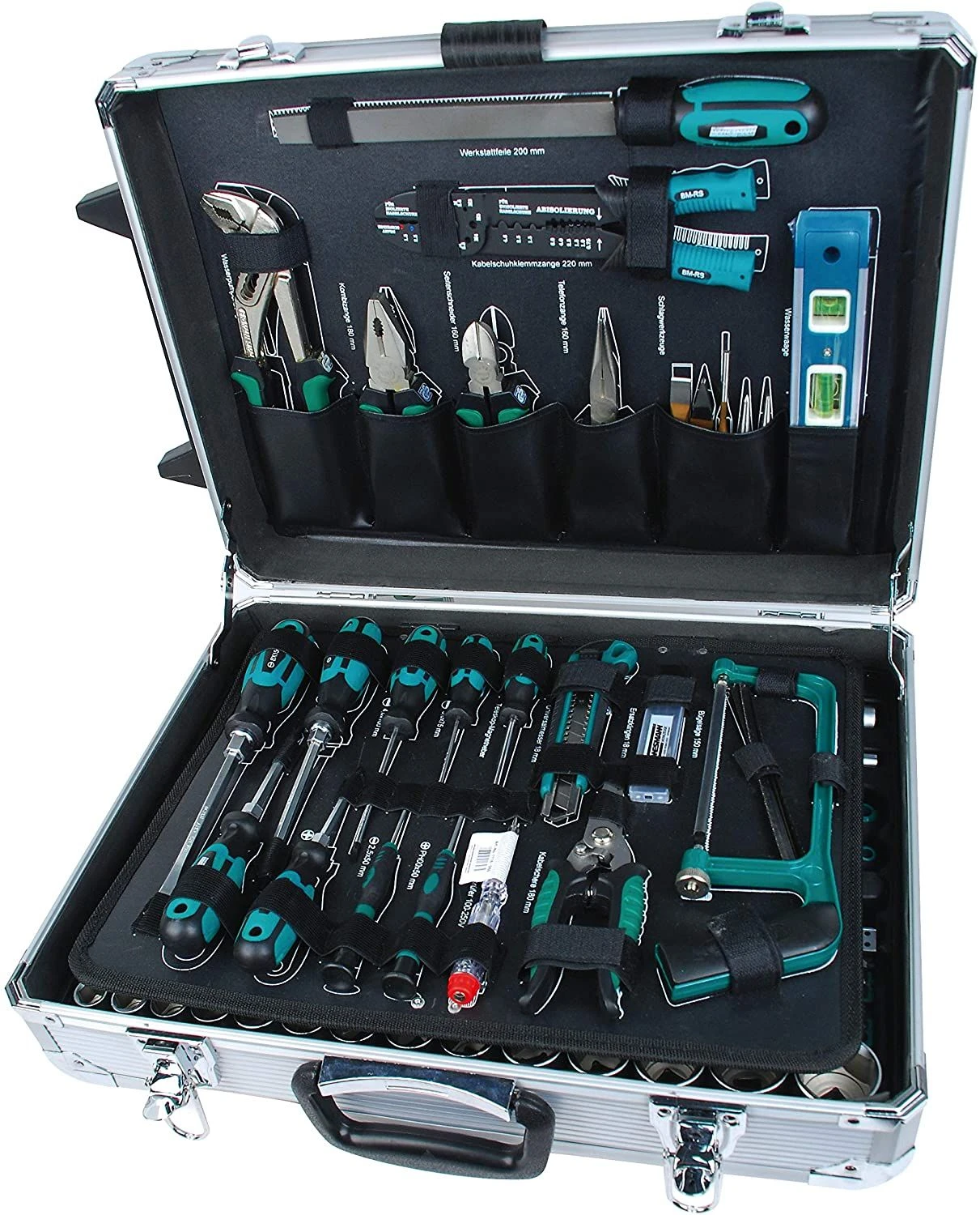 Diverse tangen, torpedowaterpas, schuifmaat, rolbandmaat, ringsteeksleutels, stiftsleutels, verstelbare moersleutel, spanningzoeker, werkplaats- en precisieschroevendraaiers, werkplaatsvijl, beitels, doorslagen, pendrijver, hobbymes met reservemessen, multi purpose werkplaatsschaar, beugelzaag met reservebladen, bankhamer en 2 ratels (1/4″ en 1/2″ aansluiting) met een uitgebreid assortiment doppen, bits, etc.