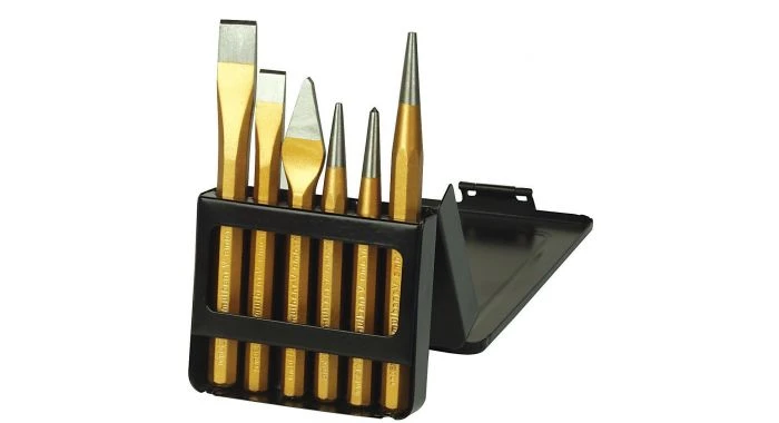 Doorslag- en beitelset, 6-delig in handige metalen bewaarbox. De set bestaat uit 2 koudbeitels (130 x 12 en 150 x 15mm), 1 ritsbeitel (130 x 4), 2 doorslagen (3 x 120 en 4 x 150 mm) en 1 centerpunt (4 x 120), gemaakt van gesmeed chroom vanadium staal met 8-kant schacht.