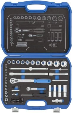 Dopsleutelset met metrische maten van 4-32 mm en een bit-assortiment voor de meest gangbare aandrijvingen zoals gleuf, PH, PZ, TXR, XZN & binnenzeskant.