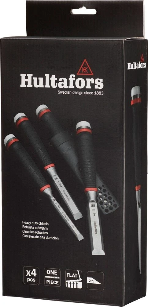 Set met 4 beitels en holsters voor elk type werk, of het nu kracht of precisie vereist. De beitels zijn uit één stuk gesmeed met twee hardingszones en een robuust I-profiel dat door het hele handvat loopt. Dit maakt ze uitzonderlijk sterk en maximaliseert de krachtoverbrenging naar het werkstuk. De rand is onder 25° geslepen en zorgt voor een optimale verhouding tussen scherpte en duurzaamheid. De beitels kunnen over bijna de gehele bladlengte opnieuw worden geslepen, waardoor ze een zeer lange levensduur hebben. De hele beitel, inclusief het handvat, kan volledig plat tegen een oppervlak worden geplaatst, zodat je een perfecte parallelle snede kunt maken. De nylon eindkap kan worden vervangen als deze versleten raakt.