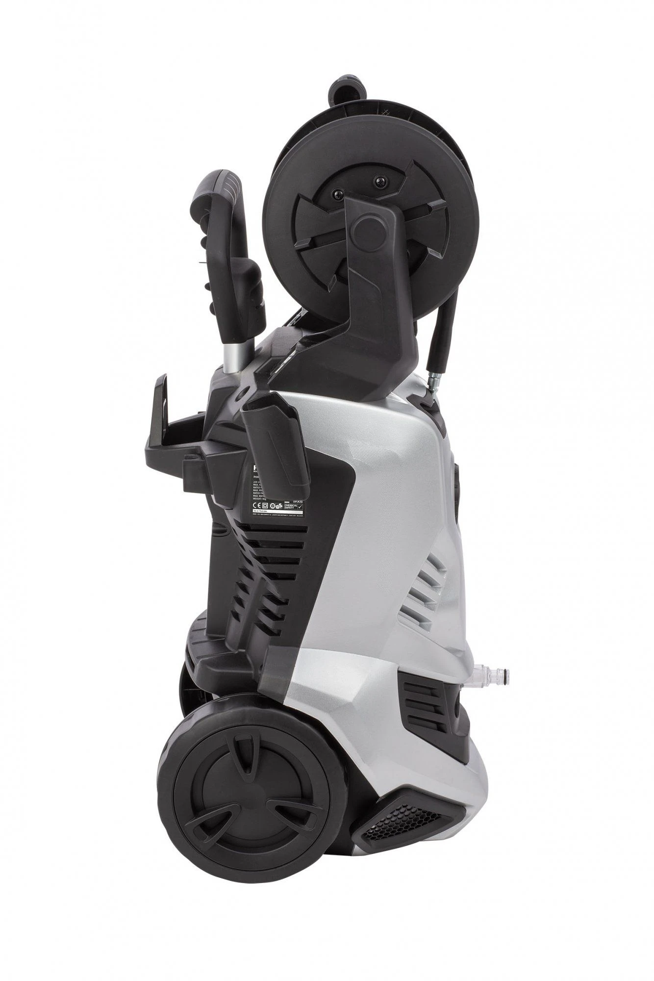 Om de hogedrukreiniger nog eenvoudiger te verplaatsen, werd naast de wielen ook een telescopisch uittrekbare handvat voorzien. De nodige bewegingsvrijheid wordt gegarandeerd door de 8m lange slang en de 5m lange kabel. Om te voorkomen dat deze in de knoei geraken, beschikt het toestel over een handige slang- en kabelhaspel.